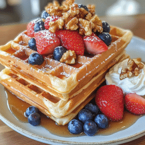 Indulge in light, fluffy Belgian waffles, perfectly golden and crispy, topped with your favorite fruits and syrup. Try this easy homemade recipe today!
